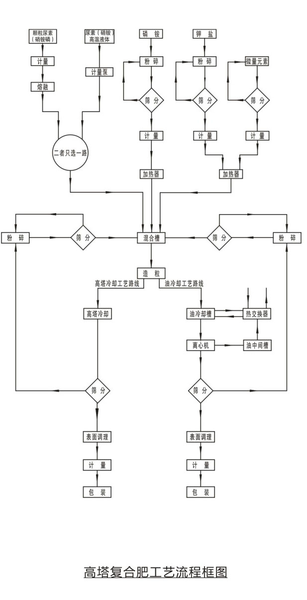 工藝原理固體尿素或硝銨(硝銨磷等)通過熔融器加熱熔融后成為熔融液,也可以直接使用蒸發(fā)濃縮后的液態(tài)尿液(硝銨)液中加入相應(yīng)的磷肥、鉀肥、填料及添加劑制成 混合料漿?;旌狭蠞{進(jìn)入高塔造粒設(shè)備進(jìn)行噴灑造粒,物料在從高塔下降過程中,與塔底上升氣流阻力相互作用,與其進(jìn)行熱交換后降落到塔底,落入塔底的物料,經(jīng)篩分表面處理后得到顆粒復(fù)合肥。